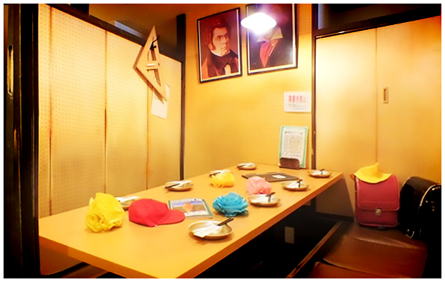 音楽室はテーブルの4席の部屋です。壁には音楽家の写真(肖像画)が飾ってあったり、懐かしいピアニカも置いてあります。腕に自信のある方は演奏してちゃってくださいね!完全個室だけど、ボリュームは控えめにお願いします。何故なら、他の教室でも授業(?)いえ、宴会で盛り上がっていますから♪