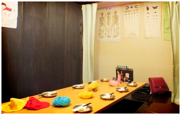 店内には、黒板にランドセル、校長室、音楽室、理科室、保険室とあの懐かしい小学校そのものです♪全席個室2名様〜60名様まで!どの教室になるかは来校してからのお楽しみ♪