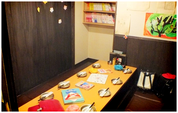 4名様までのテーブル席です。お部屋には、スケッチブックに色鉛筆、そしてクレヨンもあるんです。みんなでワイワイ言いながら、似顔絵大会が楽しめるお部屋なんです♪創作中は何かにつけ、忙しくって食事もままならないもの。そんな時は、揚げパンをお口にほおばりながら、お絵かきを楽しんでくださいね。